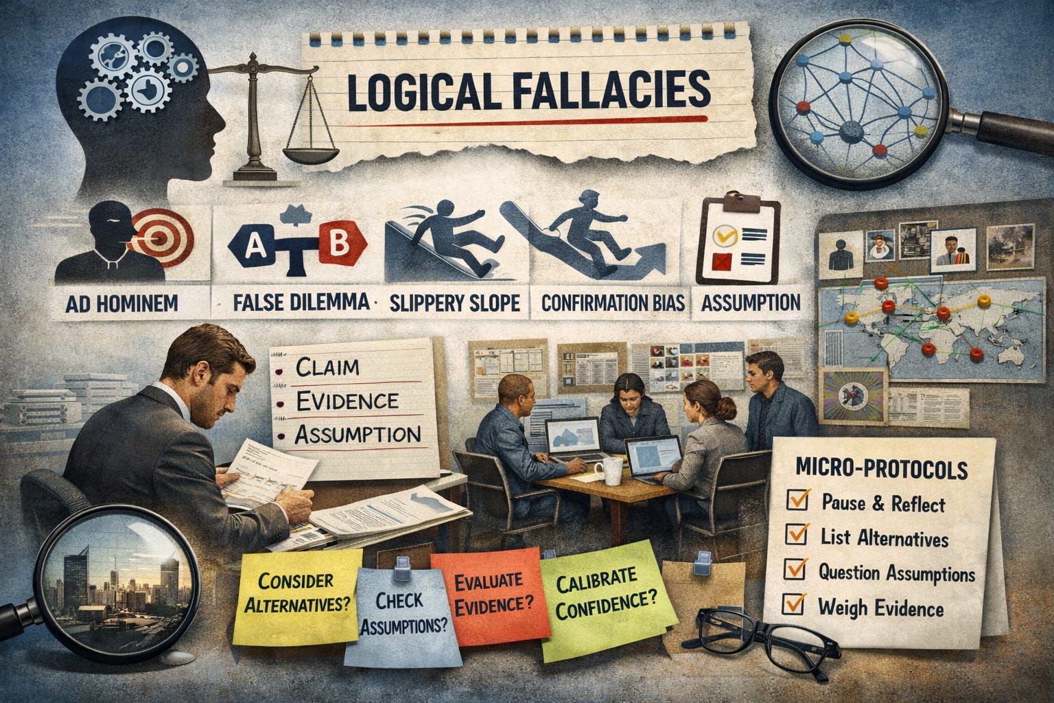 This article proceeds in a practical sequence. It defines fallacies, distinguishes them from biases, explains core categories, offers diagnostic questions for identification, and then moves to defense, mitigation, and micro-protocols. Throughout, the emphasis is on application: how to think better in conversations, classrooms, research, investigations, and intelligence products.